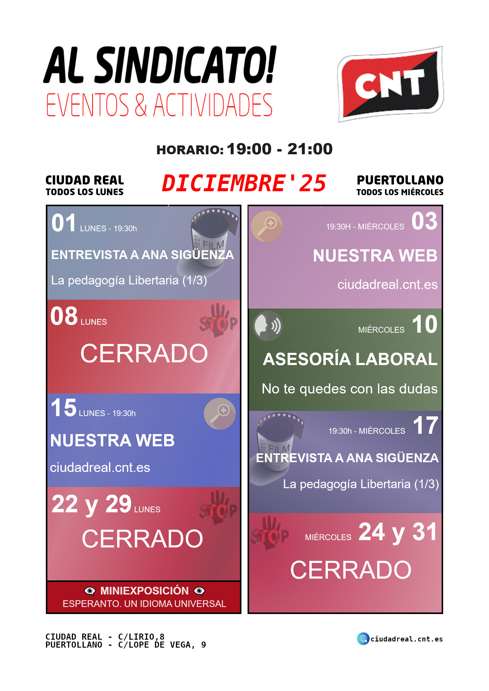 El sindicato CNT en la provincia de Ciudad Real termina el año con sus habituales actividades de sus Espacios Libres de Ciudad Real (lunes) y Puertollano (miércoles), de 19:00 a 21:00. En Ciudad Real capital se podrá visitar la miniexposición «Esperanto. Un idioma universal».